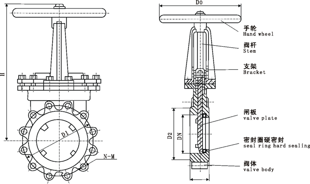 | 公称压力Nominal pressure(MPa) | 公称通径Nominal through diameter(mm) | L | D | D1 | D2 | H | N-M | D0 |